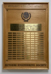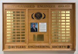 The Rutgers Engineering Alumni Association recognized distinguished engineering alumni on award plaques displayed in the Main Engineering Building – 2nd floor on Busch Campus. These plaques can be found immediately upstairs from the main entrance of the Main Engineering Building, in the hallway outside of the administrative offices.
